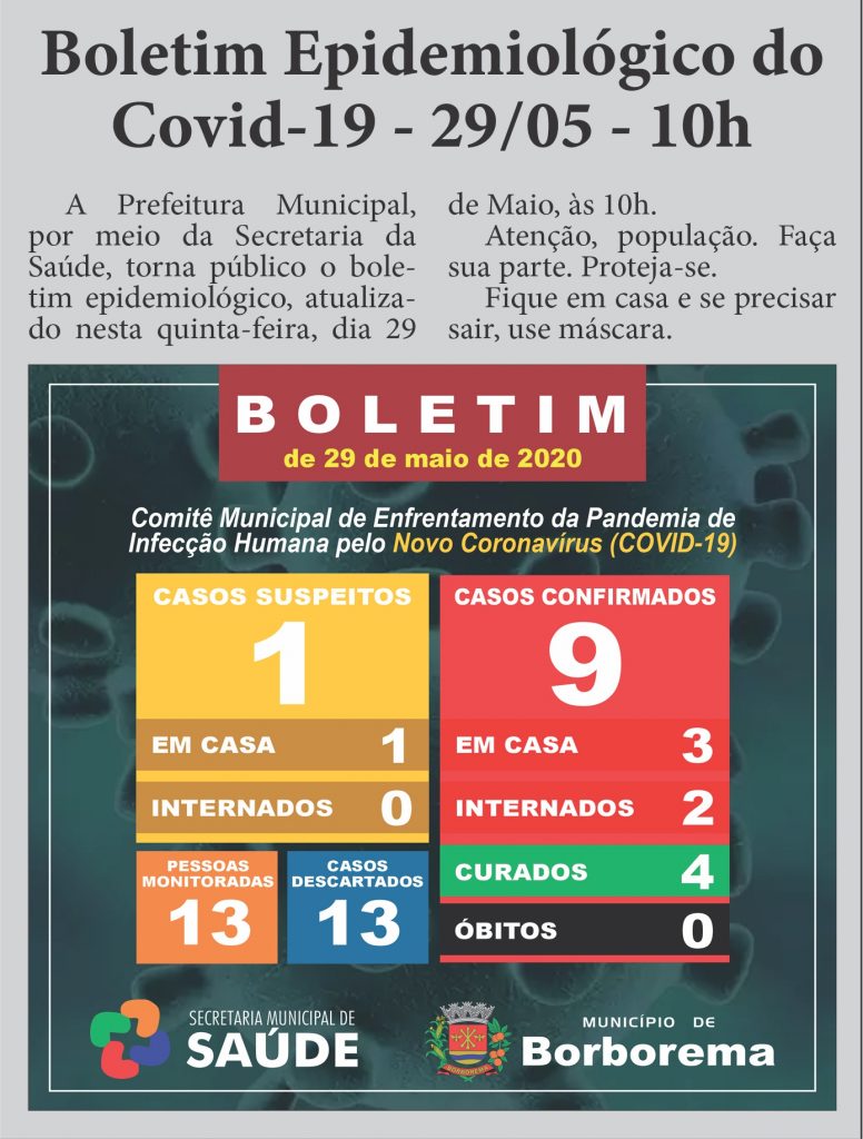 A Prefeitura Municipal, por meio da Secretaria da Saúde, torna público o boletim epidemiológico, atualizado nesta quinta-feira, dia 29 de Maio, às 10h.