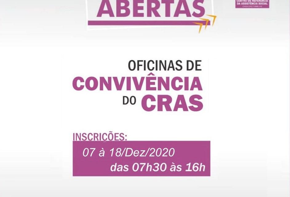 Através da Diretoria de Assistência Social e do CRAS, a Prefeitura Municipal comunica que estão abertas as inscrições para as Oficinas de Convivência do CRAS. Os cursos para o 1º Semestre de 2021 são: